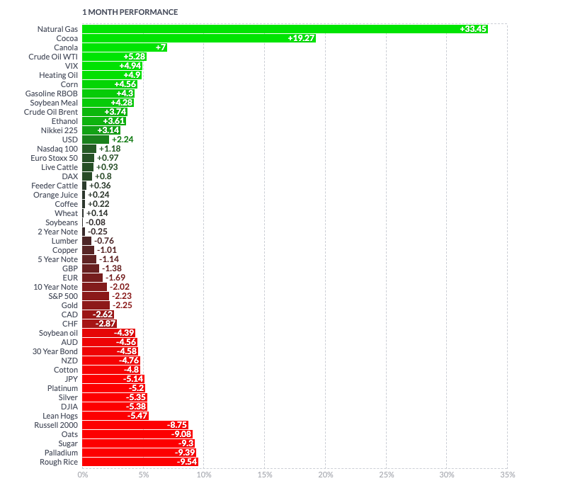 Over a one month time frame, we are seeing an interesting shift from equities in to energy, Crude oil, heating oil, gasoline and let’s not forget that natural gas is up 33% on a one month time frame.