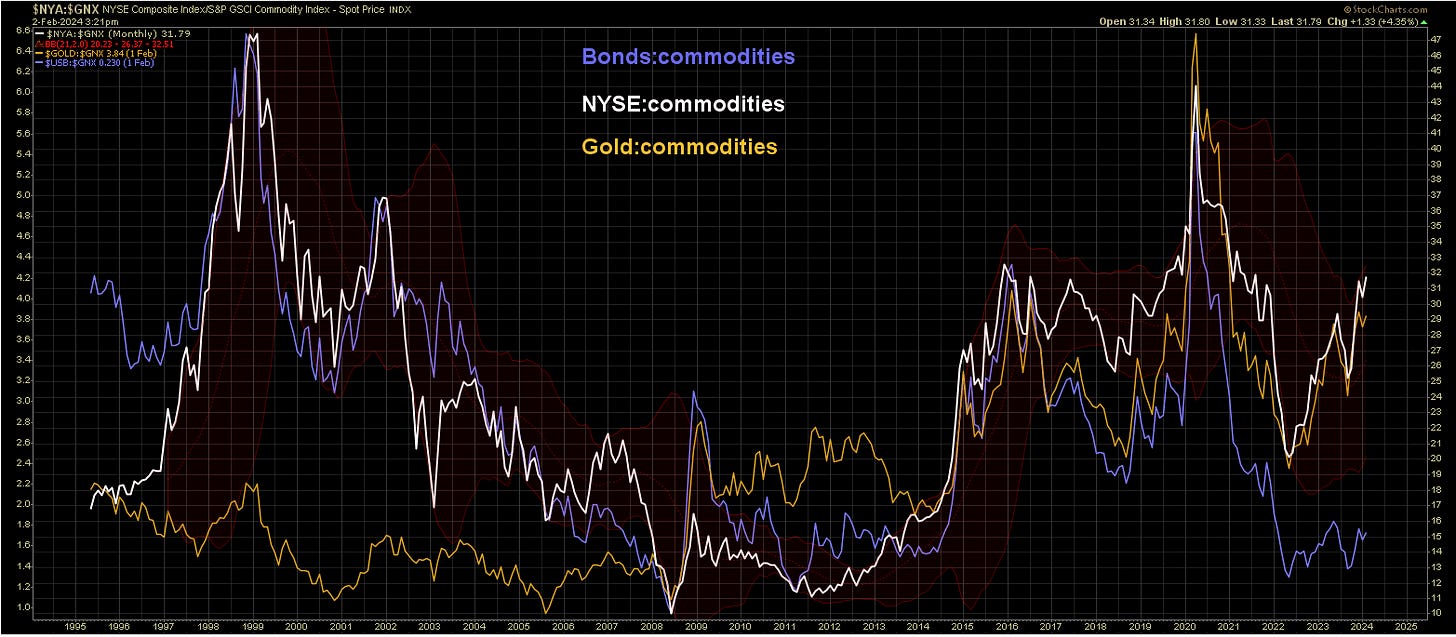 According to the current market cycle analysis, it becomes evident that stocks and gold remain at the forefront, leading the charge in terms of performance. While the commodities index, which primarily comprises energy-related assets, has displayed notable upward movements, it also highlights the need for a discerning approach when considering long-term investment strategies.