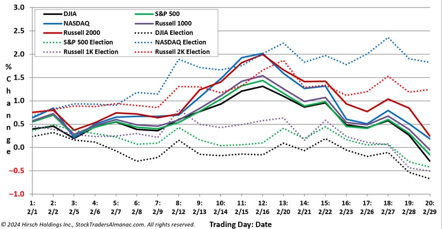 In an election-year context, February's performance exhibits mixed outcomes. NASDAQ and Russell 2000 appear to follow a trajectory akin to the past 21 years, with gains holding steady until the month's end. In contrast, the other indexes seem to meander through the month, ultimately settling for modest average losses.