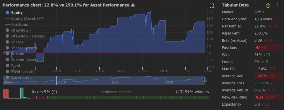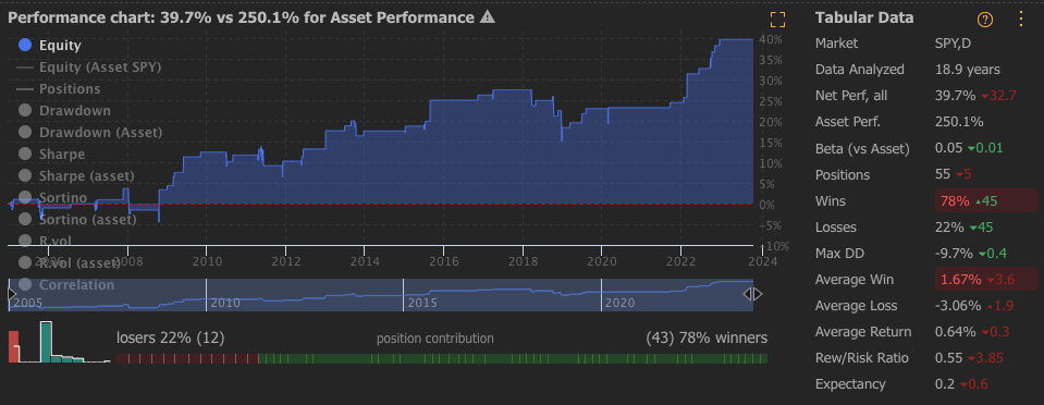 Admittedly I have fiddled with it a bunch. Take profit at 4 ATRs above entry for example. Bigger wins, bigger drawdowns. I guess I'm surprised by the dispersion, I thought they would all correlate to SPY quite a lot.