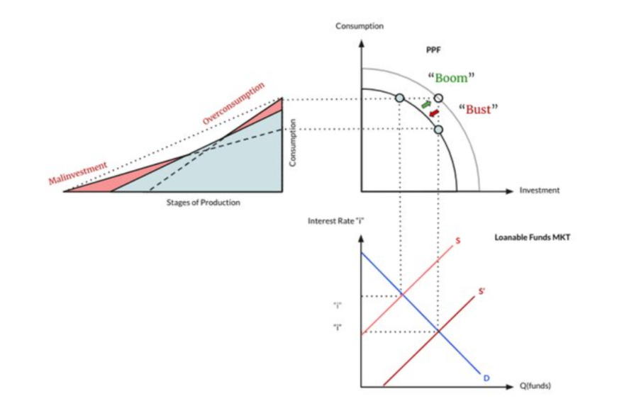 Malinvestment: The Austrian theory of malinvestment- when central banks or governments artificially lower interest rates or inject excess money into an economy, it distorts the natural allocation of capital. In response to these artificially low rates, businesses and investors may make decisions that appear profitable in the short term but are unsustainable in the long run. This leads to resources being misallocated into sectors or projects that wouldn't have been economically viable under normal market conditions. When the artificial stimulus eventually recedes or interest rates rise to their natural levels, these malinvestments are exposed, leading to economic imbalances, financial crises, and often a painful period of adjustment as the economy restructures itself to correct the distortions caused by the initial intervention. The Austrian theory of malinvestment underscores the importance of market-driven interest rates and the negative consequences of central bank interventions in the allocation of resources.