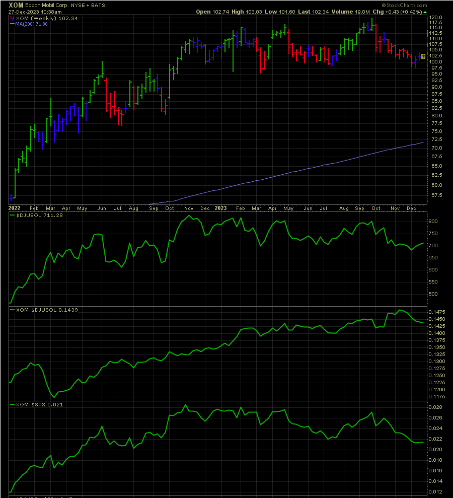 Example: RS of Exxon Mobil (XOM) relative to the S&P 500 ($SPX) is calculated as XOM Price / S&P 500 Price.