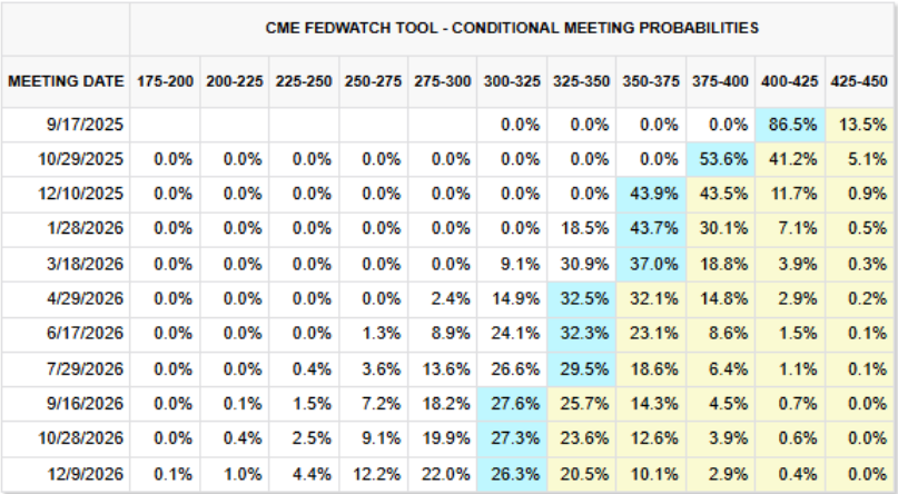 CPI came in at 2.7% YOY this morning — a touch softer than expected — and bond yields tried to rally over the last few days but remain stuck in their range. The market’s now pricing an 86% probability of a September 17th rate cut.
