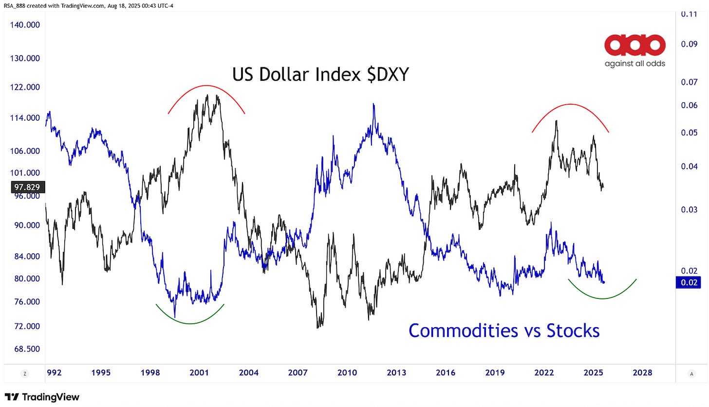 This chart shows the U.S. Dollar Index ($DXY) against the ratio of commodities vs. stocks. The symmetry is impossible to ignore: when the dollar peaks, commodities bottom. When the dollar rolls over, commodities rip higher with a lag.