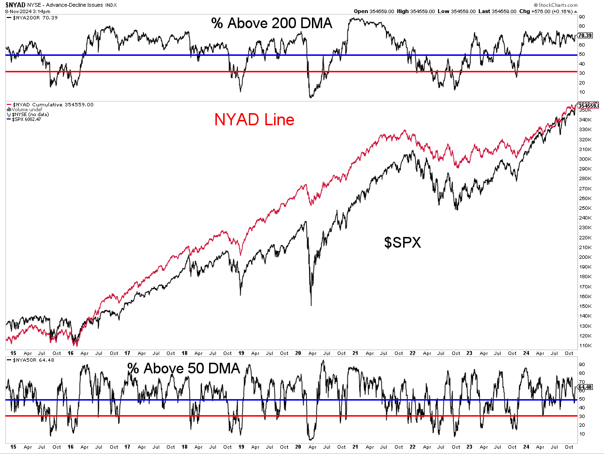 As long as we’re above the blue line on the bottom indicator (stocks above the 50-day DMA) and the top indicator (stocks above the 200-day DMA), I’m broadly bullish on stocks.