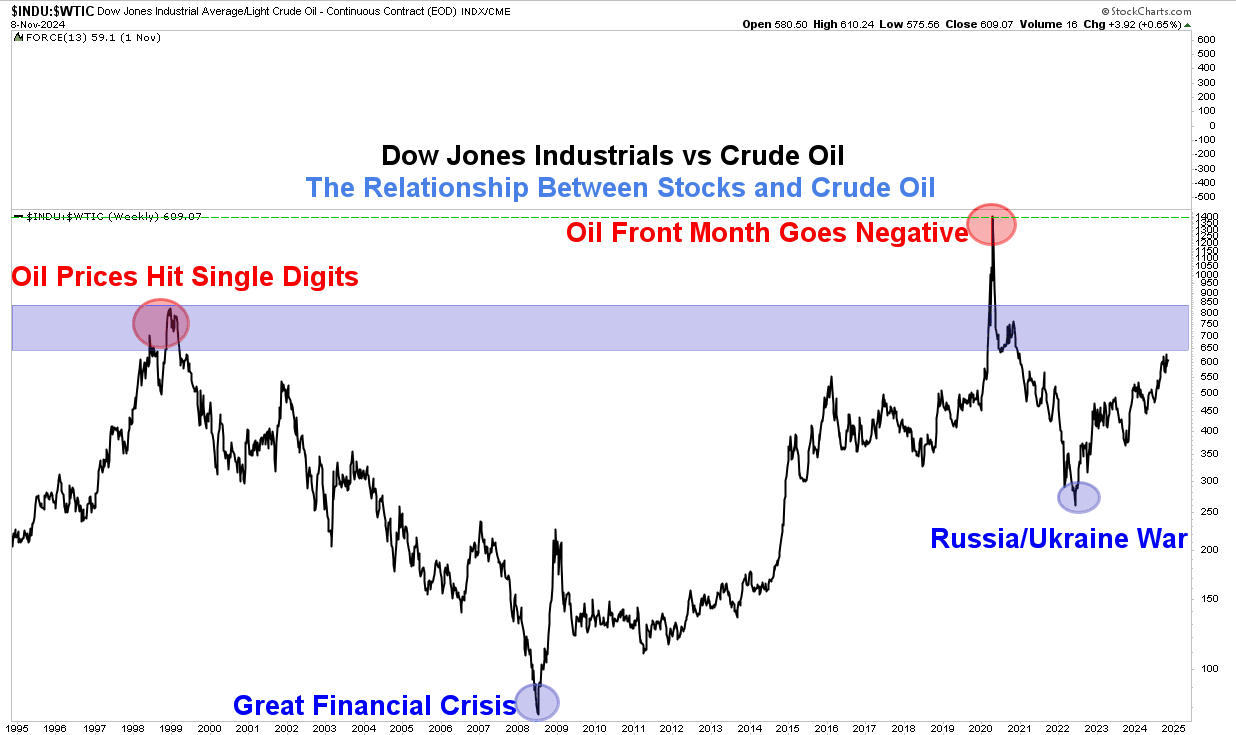We’re approaching a critical point in the relationship between the Dow Jones Industrials and crude oil.
