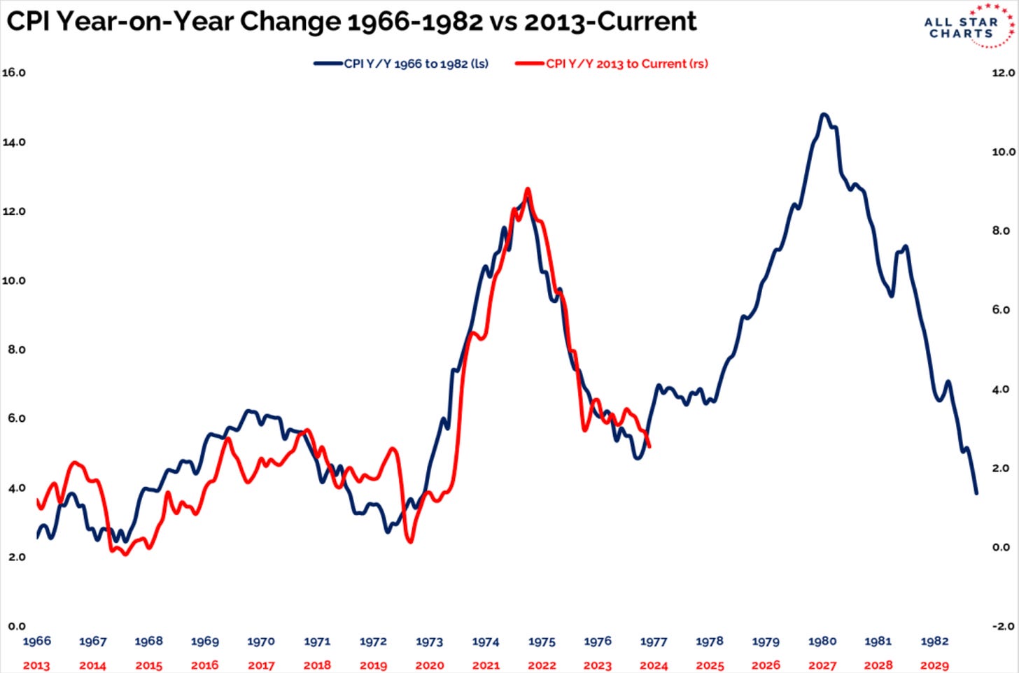 This chart illustrates the rate of inflation, highlighting three waves it went through in the 1970s. While I’m usually cautious about drawing direct parallels with charts like this, the similarities to today’s situation are too striking to ignore.