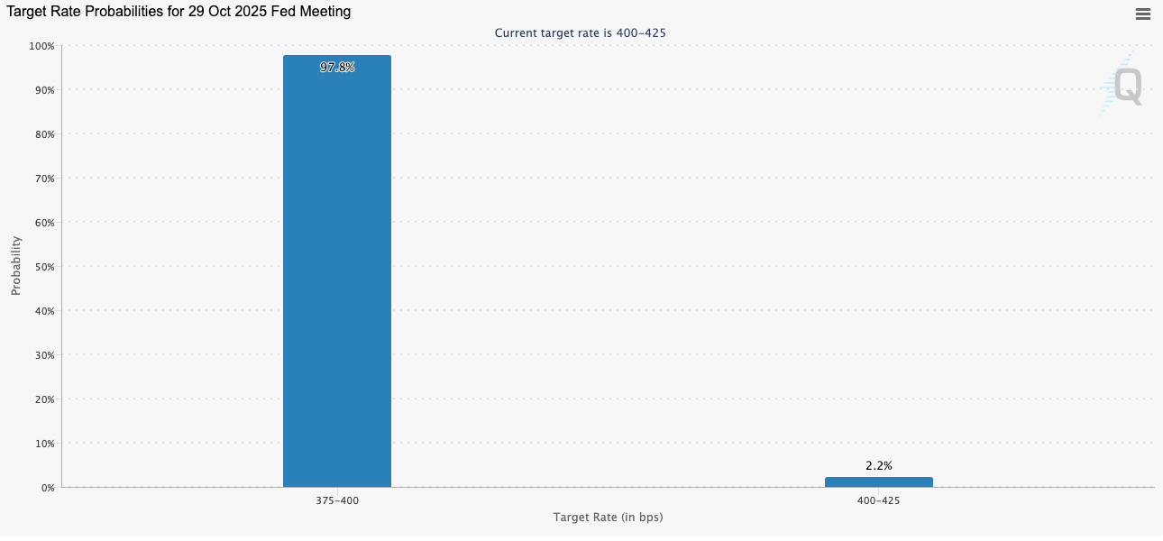 As of today, the market is pricing in a 97.8% chance of a 25 bps cut.