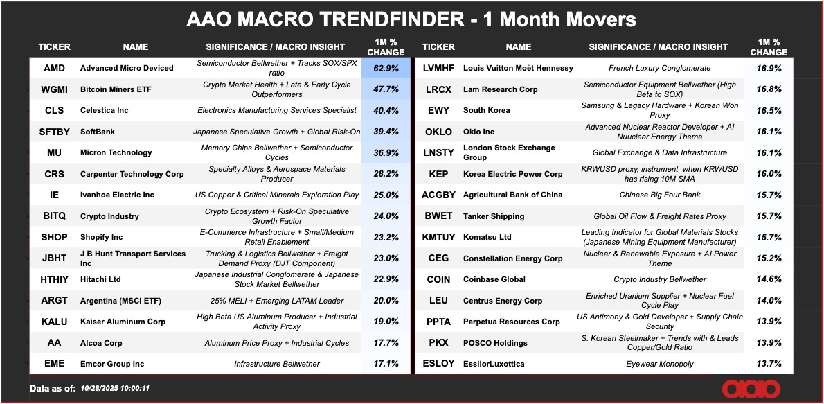Fueling the Next Supercycle: I’m Buying...CEG clears a year long ceiling, confirming leadership in the power that fuels AI and renewables.Jason PerzOct 28, 2025∙ Paid92ShareThe Power Behind the MoveSometimes the market hides its strength in plain sight.You just have to know where to look.AAO Macro Trendfinder ScanThis table tracks the strongest names across sectors — stocks that are leading their peers and confirming what the macro data is already telling us.SubscribeThis post is for paid subscribersSubscribeAlready a paid subscriber? Sign inPreviousNext