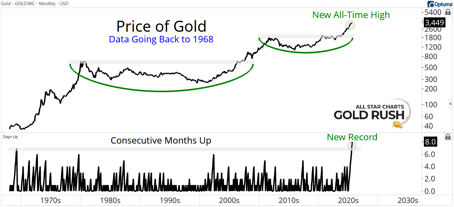 Gold just made history. For the first time ever, spot gold has closed higher for eight consecutive months. Not in the 1970s. Not in the 2000s. Never before.