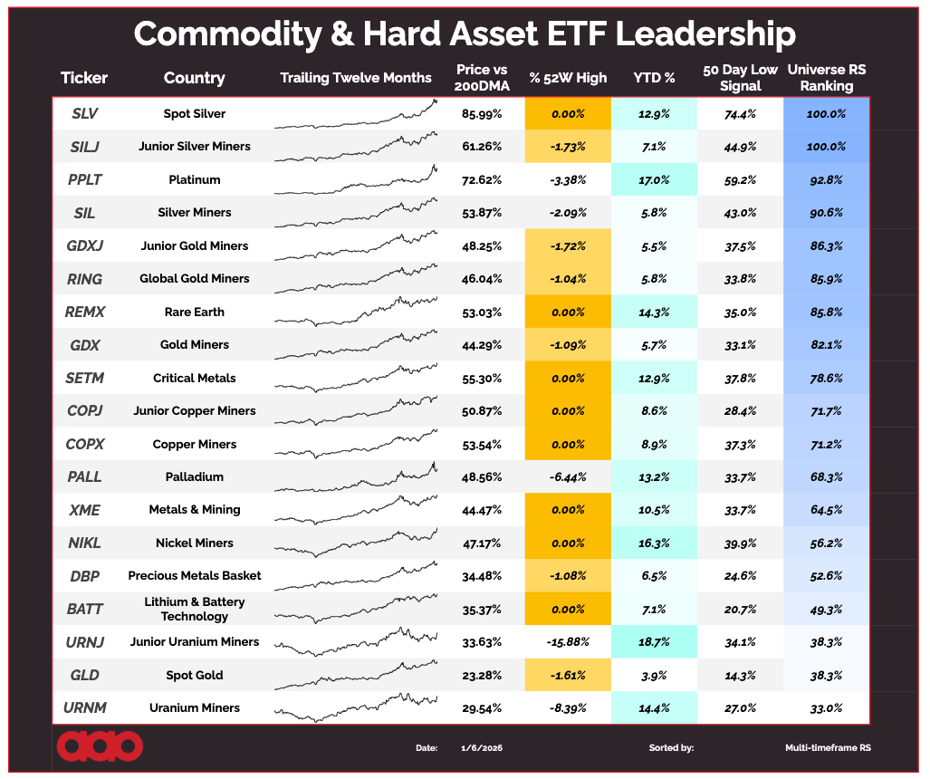 The Commodity & Hard Asset ETF Leadership scan above is doing exactly that right now. It’s quietly confirming something we’ve been living through all year: