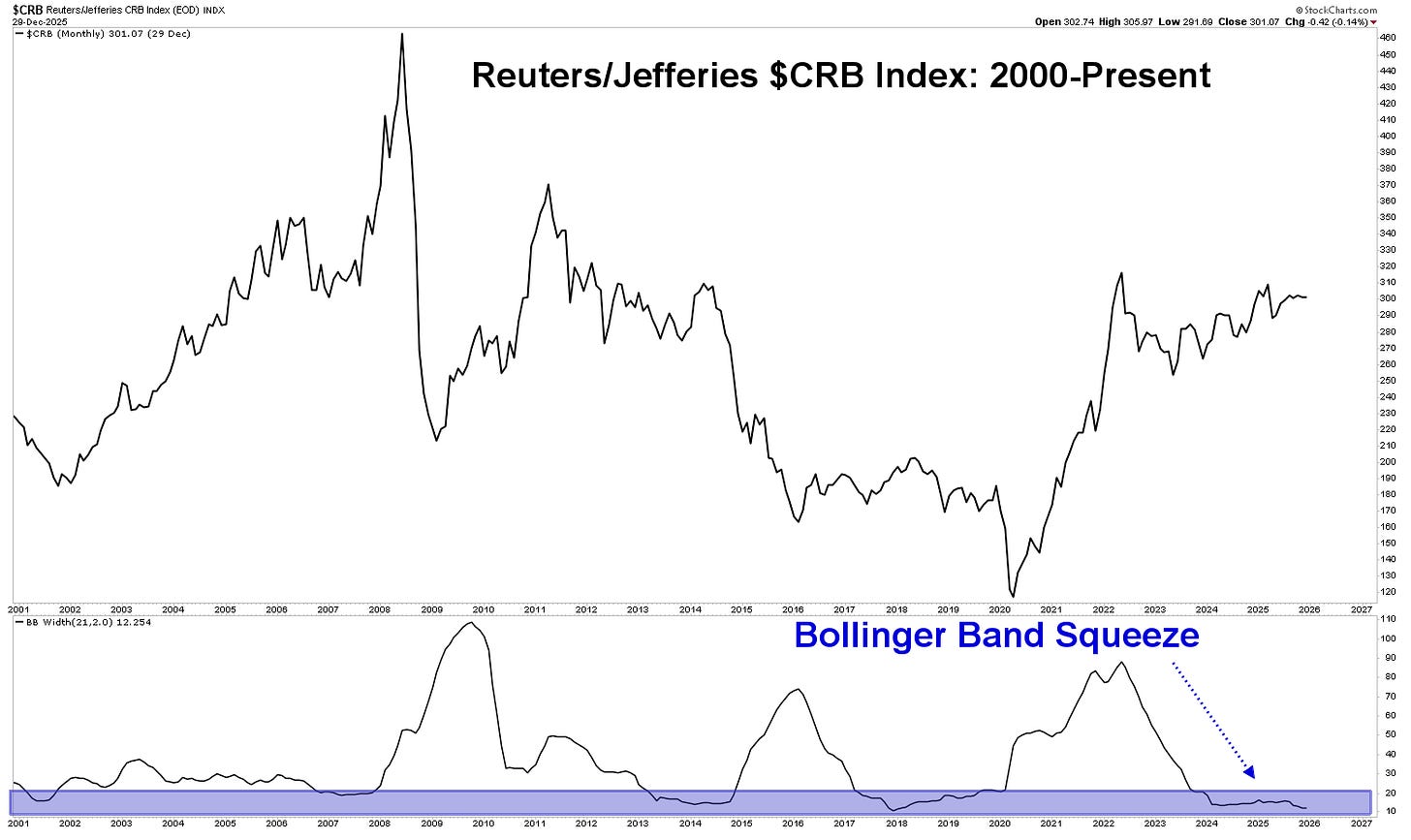 The Reuters/Jefferies CRB Index is sitting in a multi-year Bollinger Band squeeze — the kind of compression you only see before large, sustained moves.