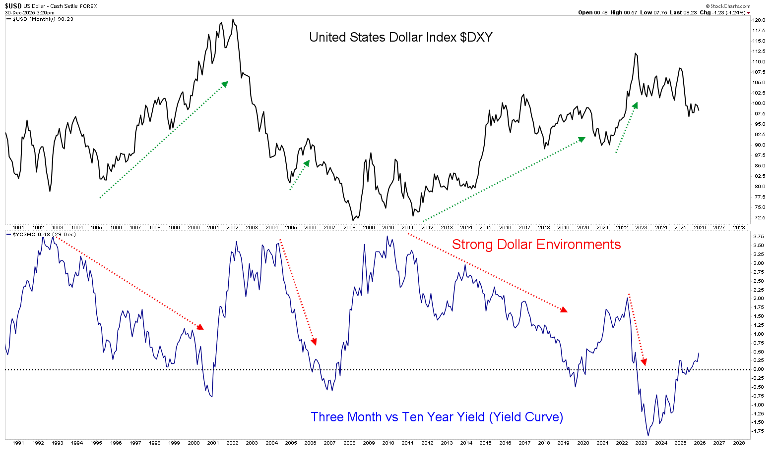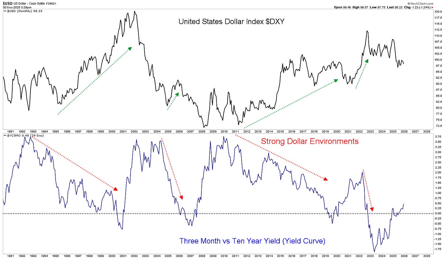 The U.S. dollar is rolling into a weak-dollar regime, and the yield curve is steepening. Historically, that combination has been one of the cleanest early signals for future inflation pressure — not immediate CPI spikes, but structural inflation building beneath the surface.