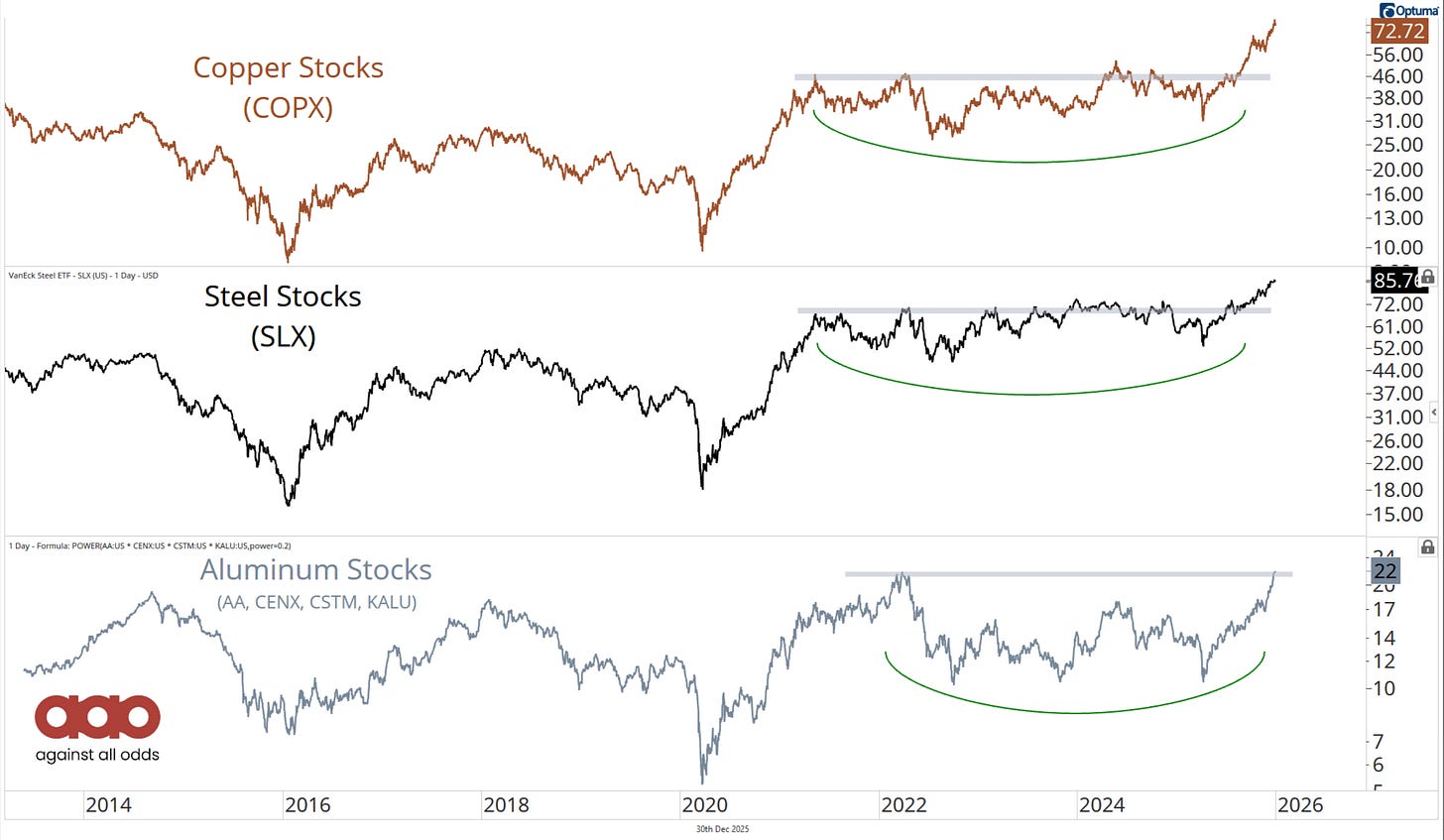Gold miners have been on an absolute tear. Large parts of the gold-mining complex are approaching +165% for the year. That’s not a trade. That’s a regime shift.