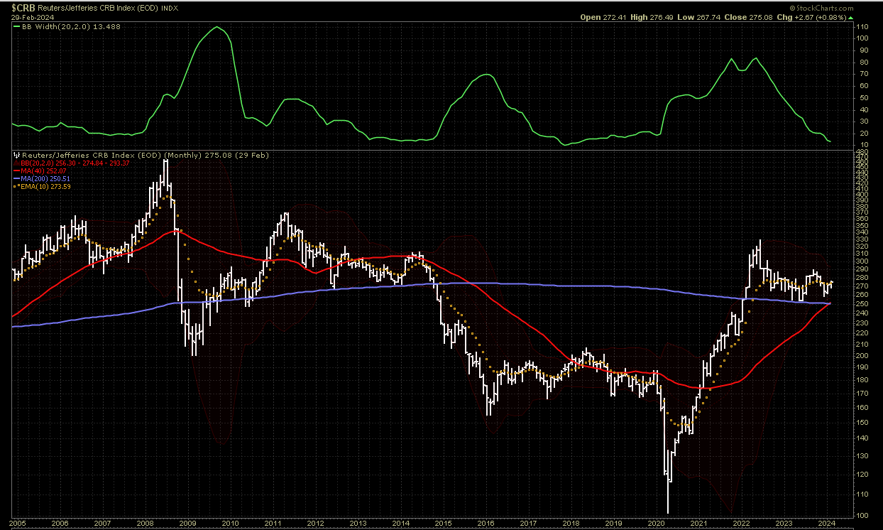 The CRB index has put in a higher low as well as a band squeeze. It is also very close to getting a monthly golden cross signal. The index has not seen one since 2003 and oil went from roughly 25 dollars all the way to 150 dollars in the 2000s.