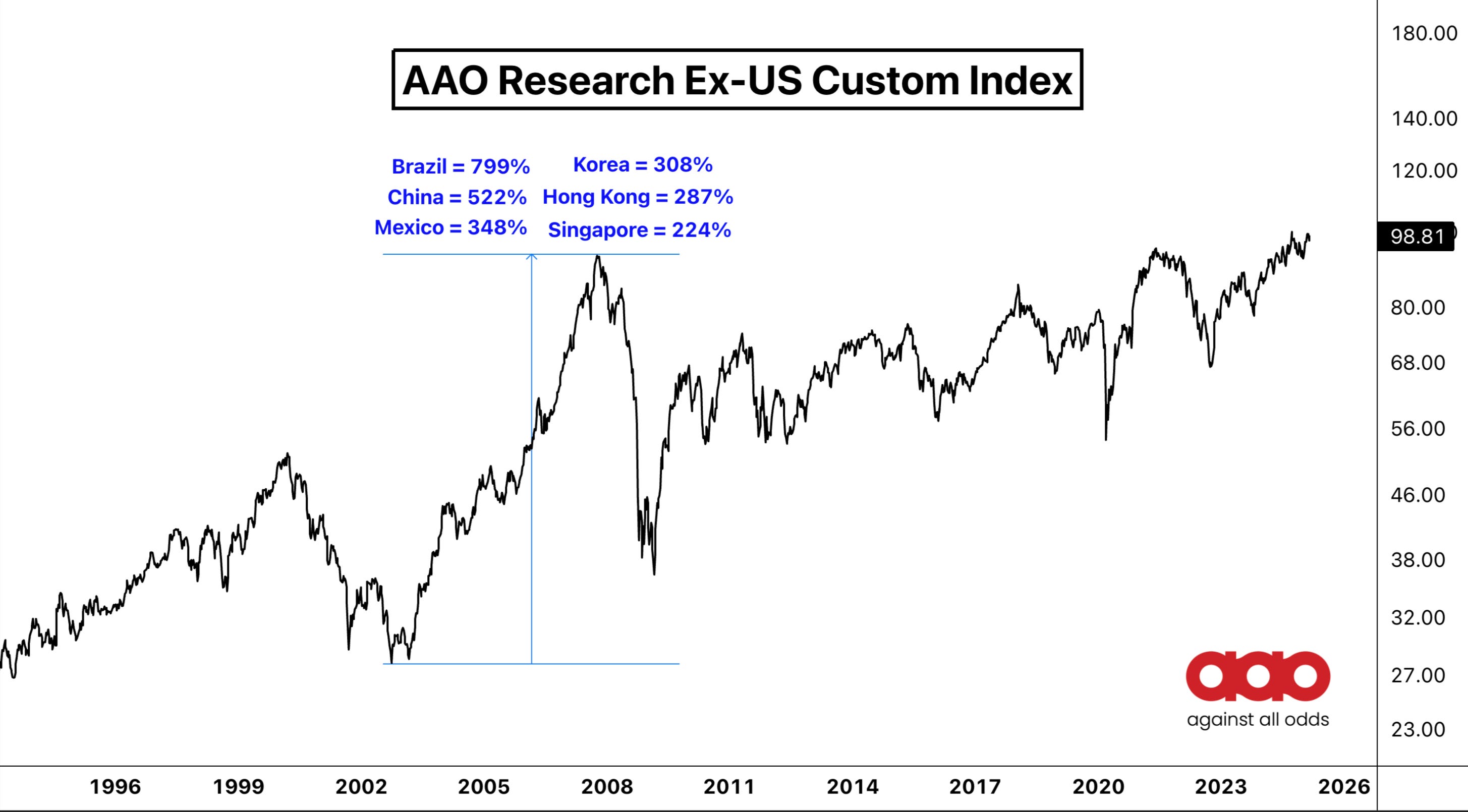 Rick (@NullCharts) helped me go further back with a custom all-world ex-US index. It tells the same story. Momentum is real. It’s just not where most people are looking.