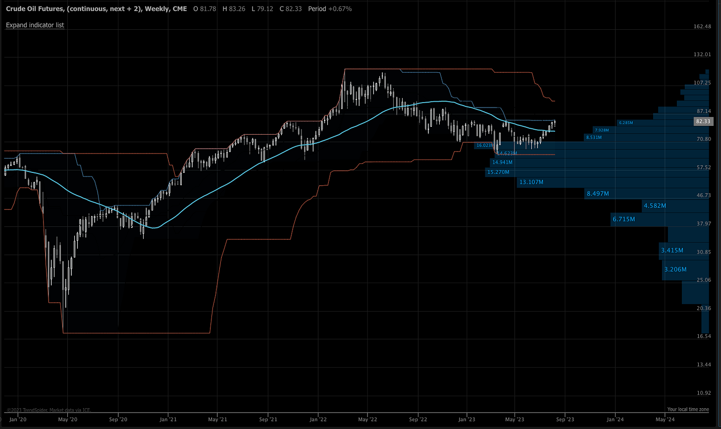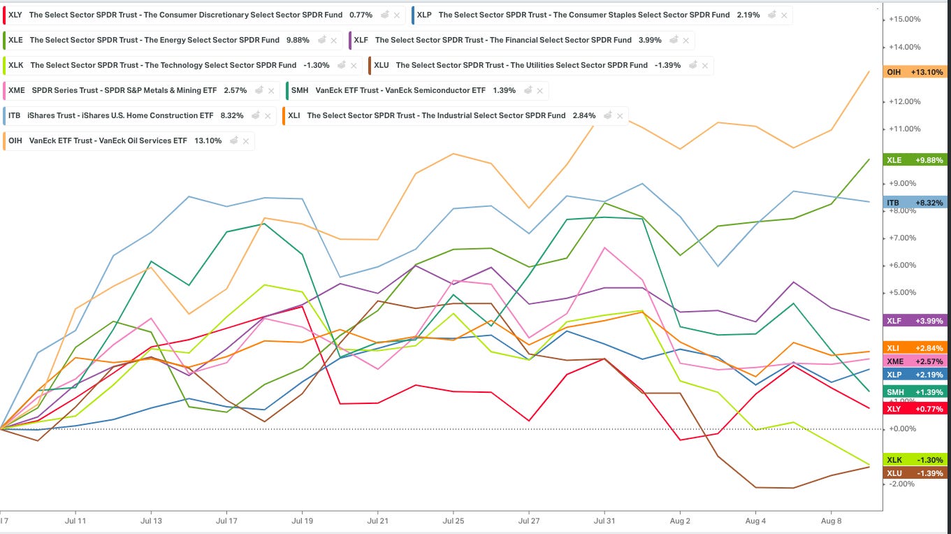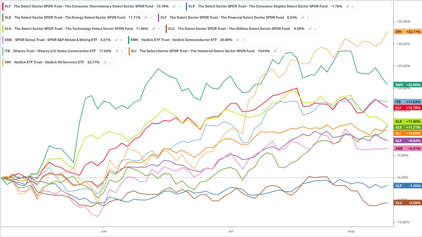 Oil is also making a 100 day high. It has joined gasoline, heating oil, the energy sector… Tony Greer from TG Macro put it this way… “Sep/Oct WTI held 42 cents and rallied toward 60 cents by the close. Sep/Oct gasoline held 22 cents and bounced sharply. Sep/Oct diesel saw an outside reversal day UP at the bottom of a 50% pullback. The crack spread came back “FORTY BID!” The cherry on top of the cake is WTI breaking the range top. This is what bull markets look like.”