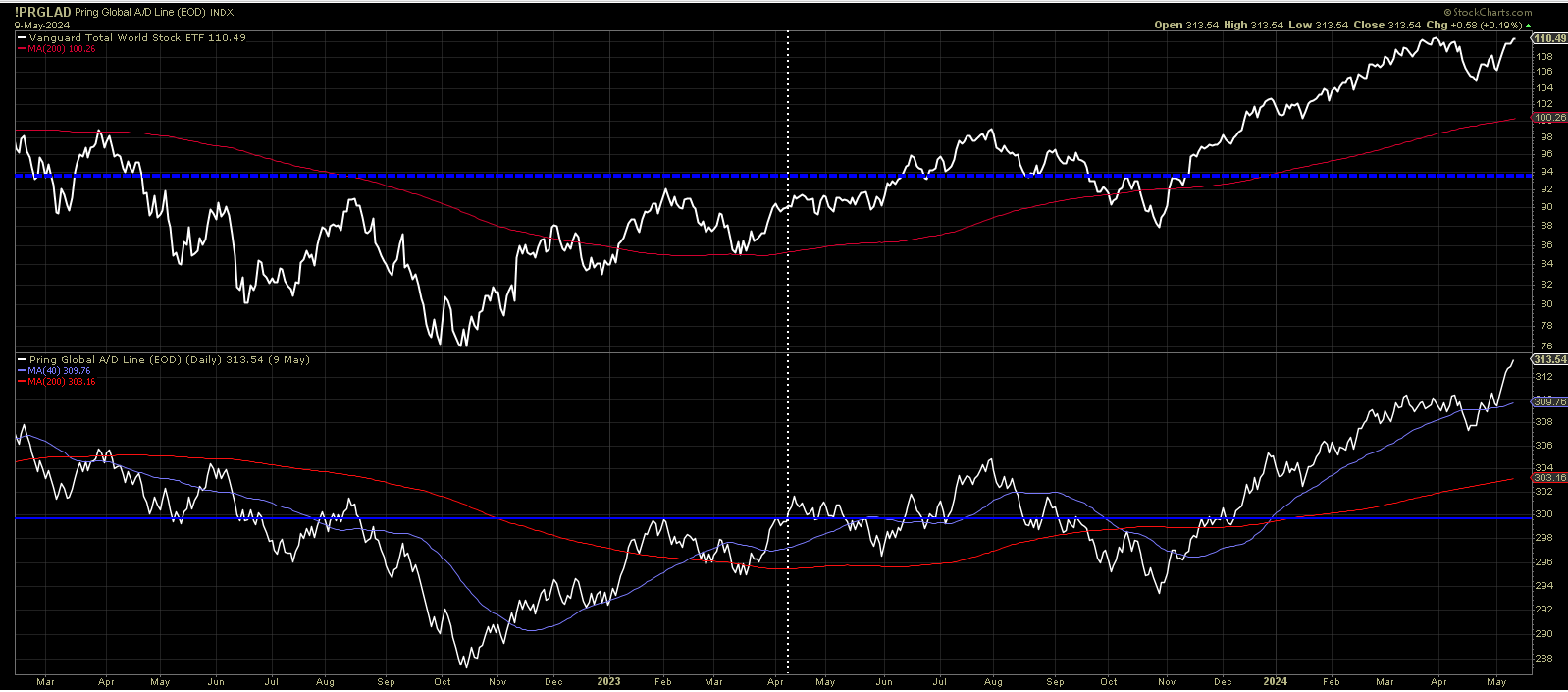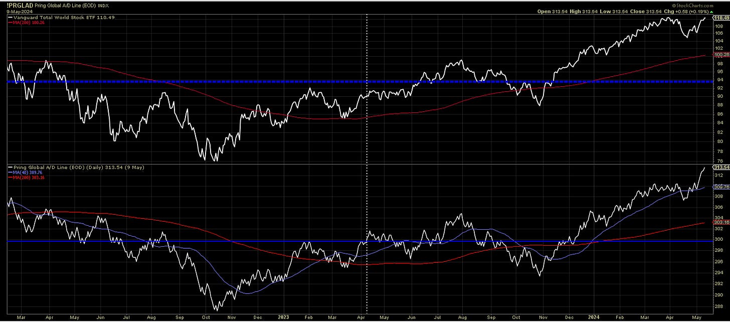 The global AD line is showing strength. This is a sign that we are seeing a rotation in to other areas around the world and also that stocks most likely will hit a new all time high.