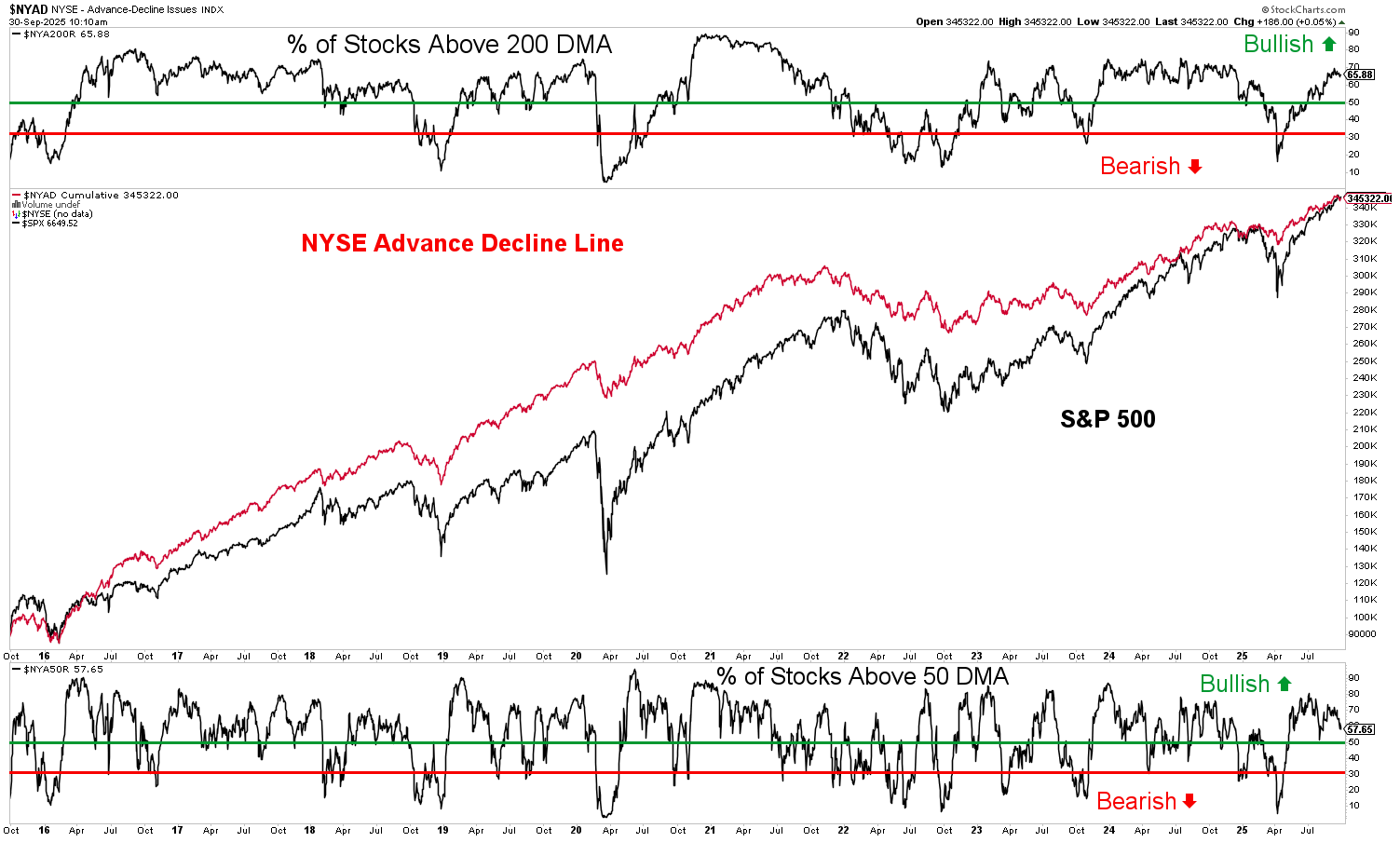 The percentage of stocks above their 200-day moving average is sitting solidly in bullish territory. The NYSE advance-decline line is trending higher. Even the 50-day breadth looks fine.
