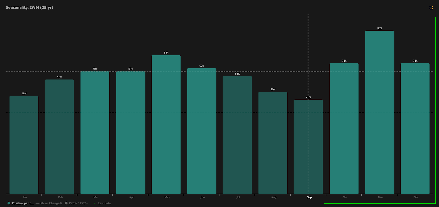 Look at the seasonality chart for small caps (IWM). September is garbage, no surprise there. But October through December? That’s where the stats flip. 64%, 80%, and 64% positive months in a row. That’s small cap season.