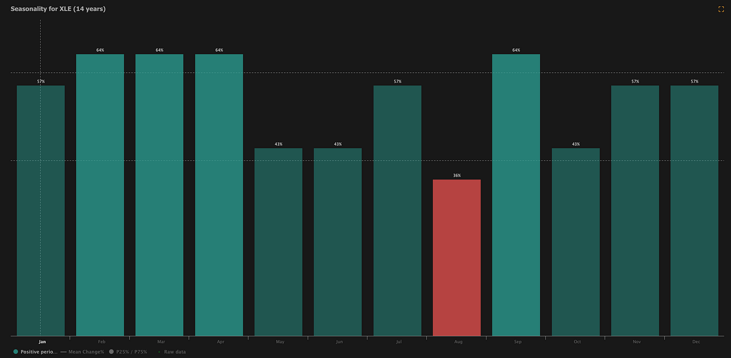 5. XLE energy sector-Getting in to a bullish period. However, oil is up over 70% of the time in February and gasoline is up over 80% of the time in February.