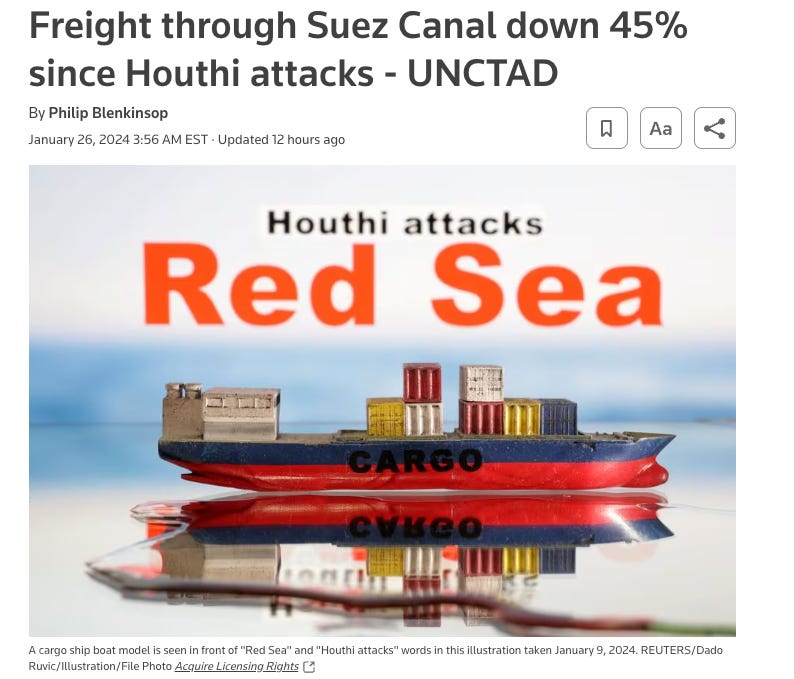 In response to the Iran-aligned Houthi movement's attacks on vessels, which it claims are in support of Palestinians in Gaza, shipping companies have rerouted their ships away from the Red Sea. The Houthi movement controls most of Yemen's populated areas. In retaliation, the United States and Britain have launched airstrikes against the Houthis.