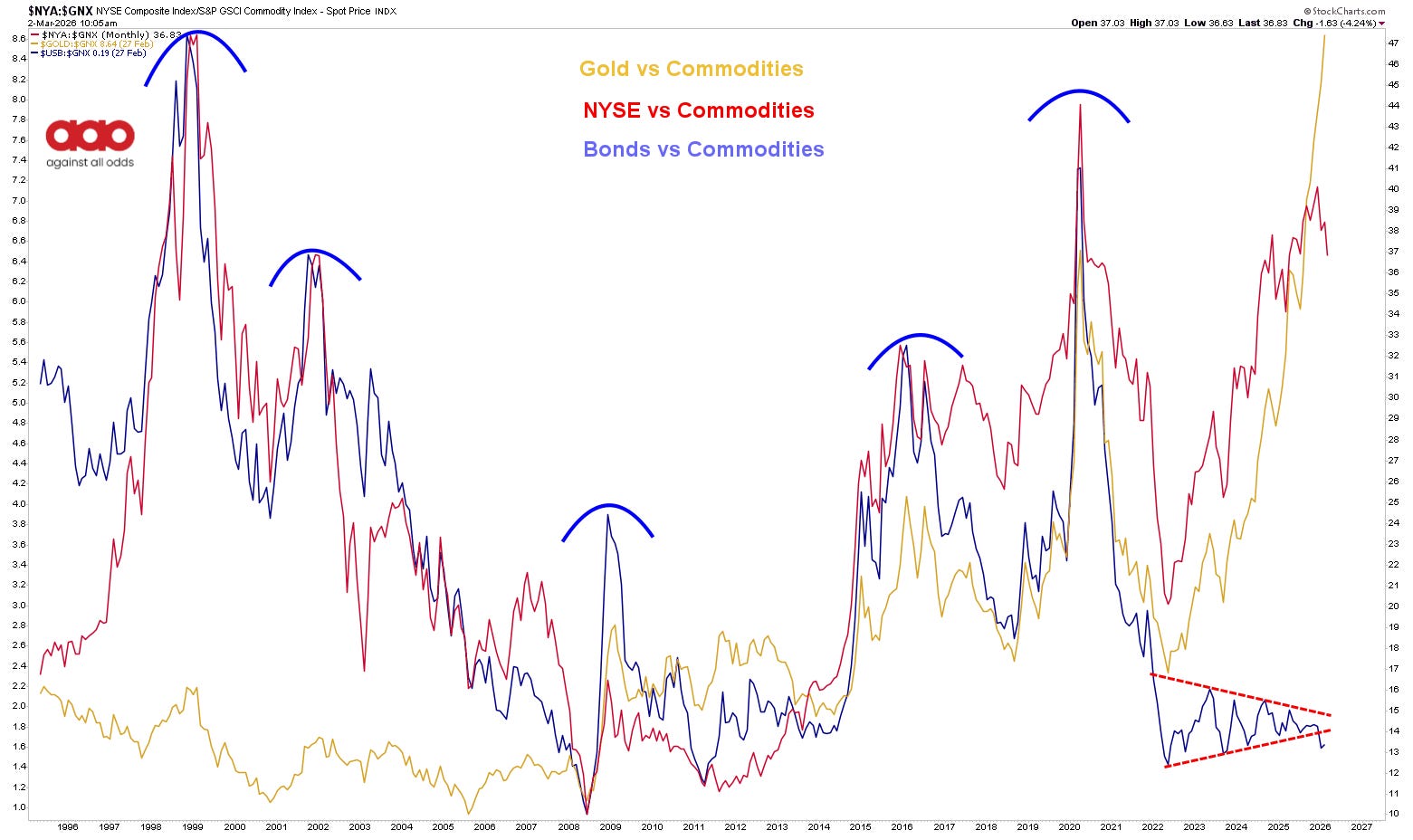 For years, capital has oscillated between financial assets and hard assets. When these lines rise, it means stocks, gold, or bonds are outperforming the broader commodity complex.