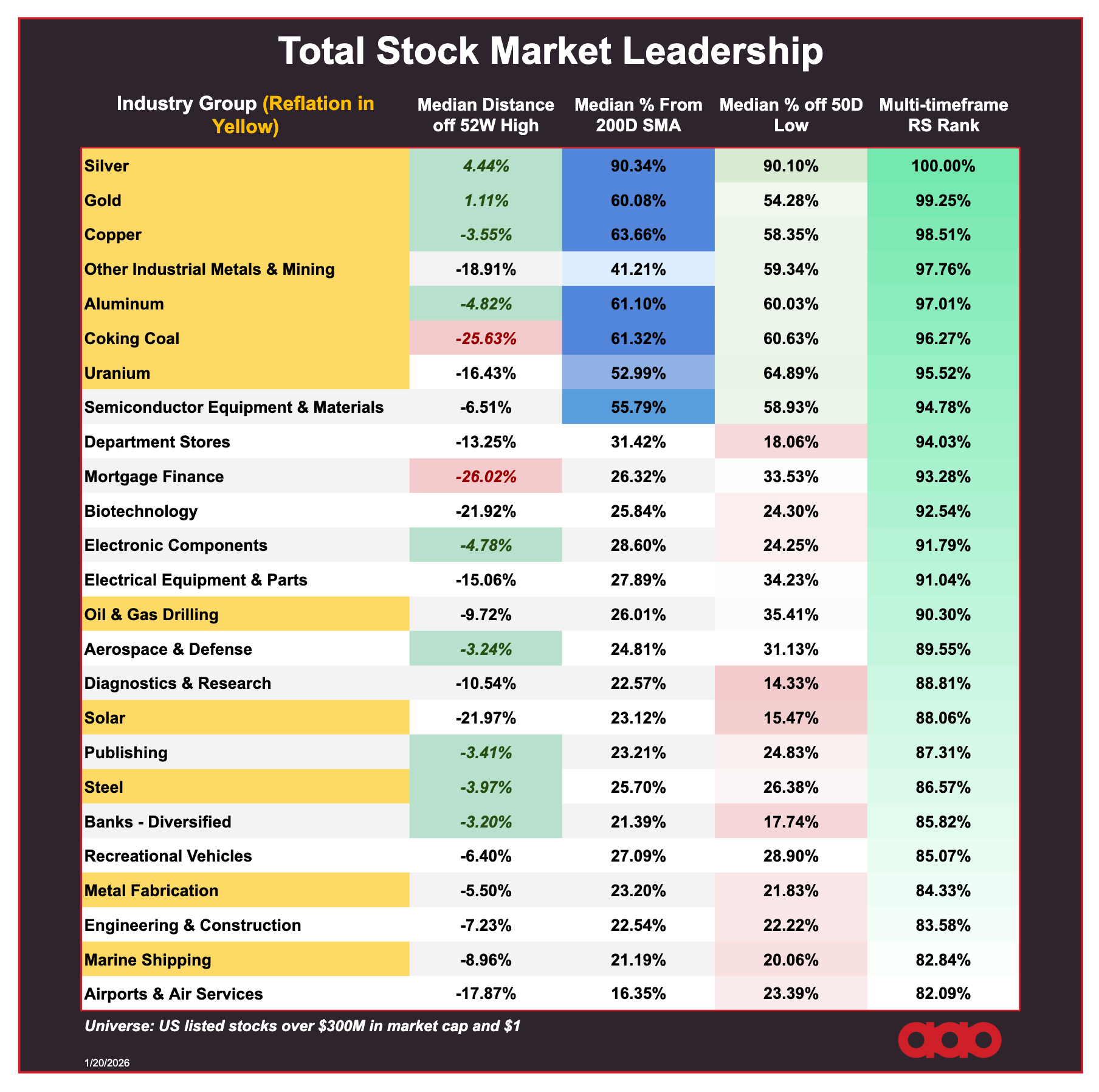 Start with the Total Stock Market Leadership scan. The most important detail here isn’t just who’s near the top — it’s who shouldn’t be there if this were a risk-off or disinflationary environment.