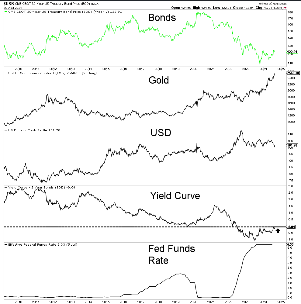 Gold is the missing piece. Typically, bonds and gold move in opposite directions, with inflation boosting gold while hurting bonds. However, in a late-cycle environment, they can rise together as monetary easing lowers interest rates and boosts bond prices.