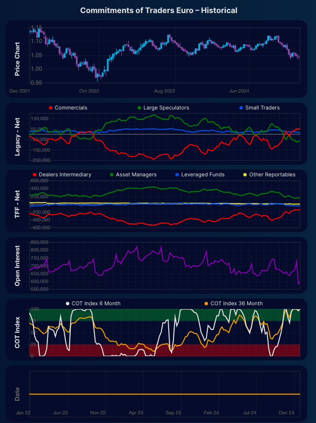 The commercials (red line on the legacy index) are net long the Euro with declining open interest, often a signal for potential reversals.