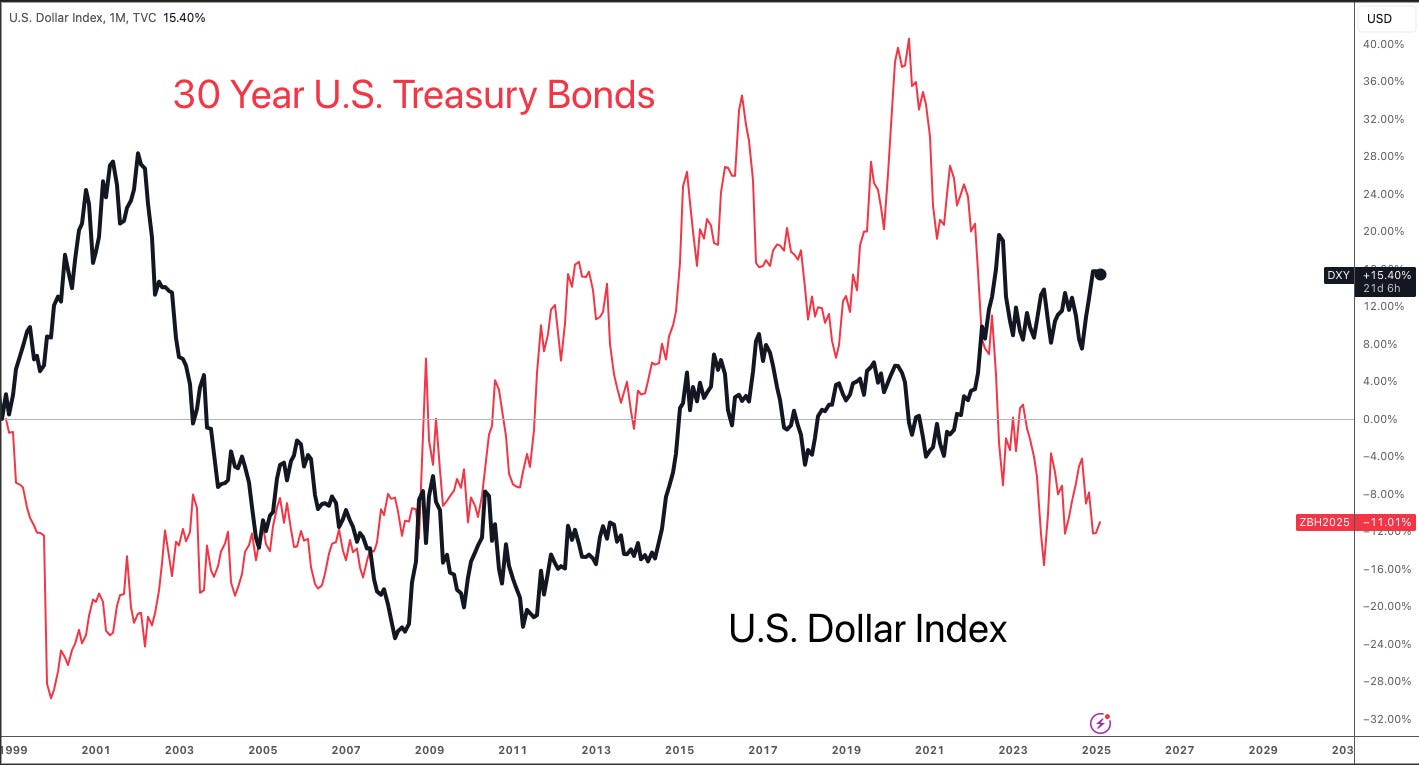 And here’s the thing—what’s been holding back the commodity super cycle for the last two years? The dollar.
