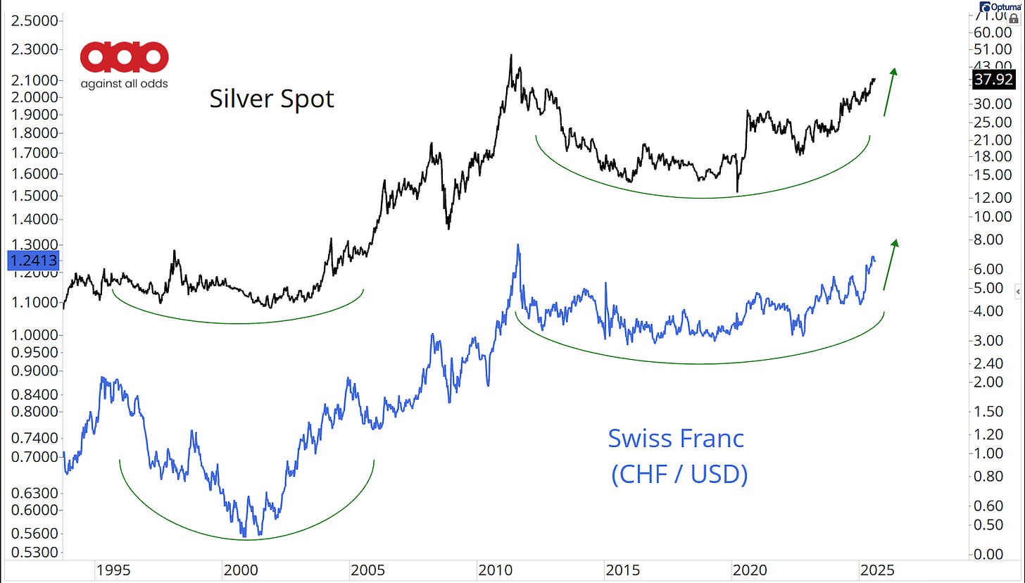 Look it up. Switzerland’s monetary history is unique, and its role in the global system explains why the franc and silver so often move together. That connection isn’t coincidence. It’s structure.