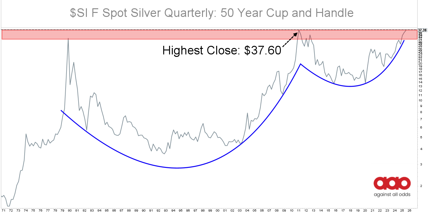 Take a step back. On a 50-year chart, silver has been building one of the biggest cup-and-handle patterns you’ll ever see. These patterns, when they resolve, don’t just break — they explode.