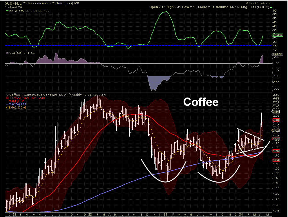Coffee-Positioning has become a bit crowded so we may see a stall in our rally here but technicals and fundamentals are still telling us that it could move higher. Still holding!
