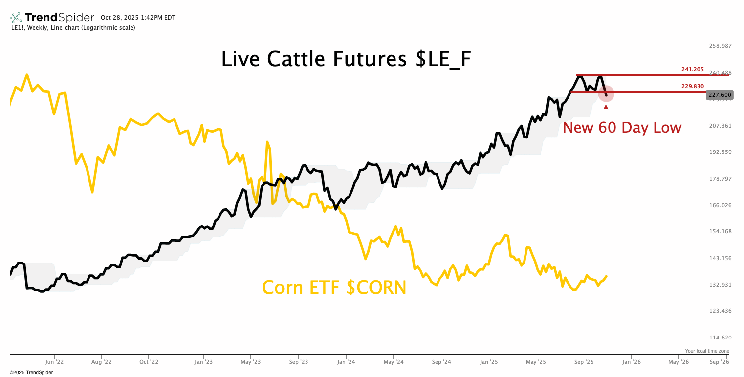 The black line is Live Cattle Futures ($LE_F) — the yellow line is Corn ($CORN).