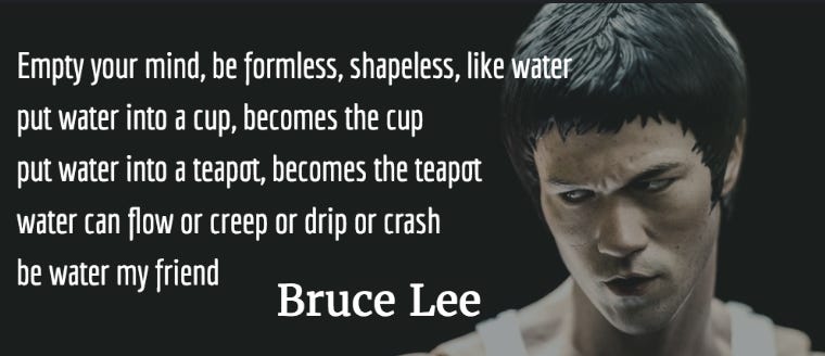 "Be water, my friend" is a famous quote from Bruce Lee, encouraging flexibility and adaptability. He believed that just like water, we should be able to adapt to any situation. Water takes the shape of any container it’s in, whether it's a cup, a bottle, or a teapot. It can be gentle and flowing, or powerful enough to break through rock. By being like water, we can be more resilient and better handle life’s challenges by adapting our approach as needed.