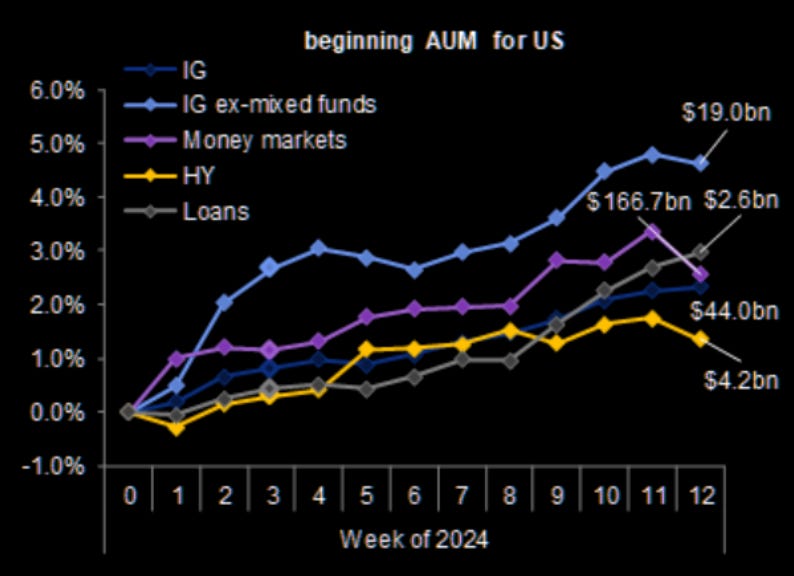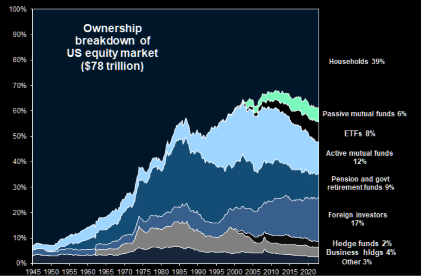 From Goldman "We expect households will be net buyers of $100 billion in US equities in 2024. Households are the largest owners of the US equities, directly holding 39% of the market. Household equity demand has typically been strongest during periods of solid economic growth. Despite elevated equity allocations, we expect that record levels of money market AUM, falling cash yields, and the strong economic outlook will drive households be net buyers of US stocks in 2024."