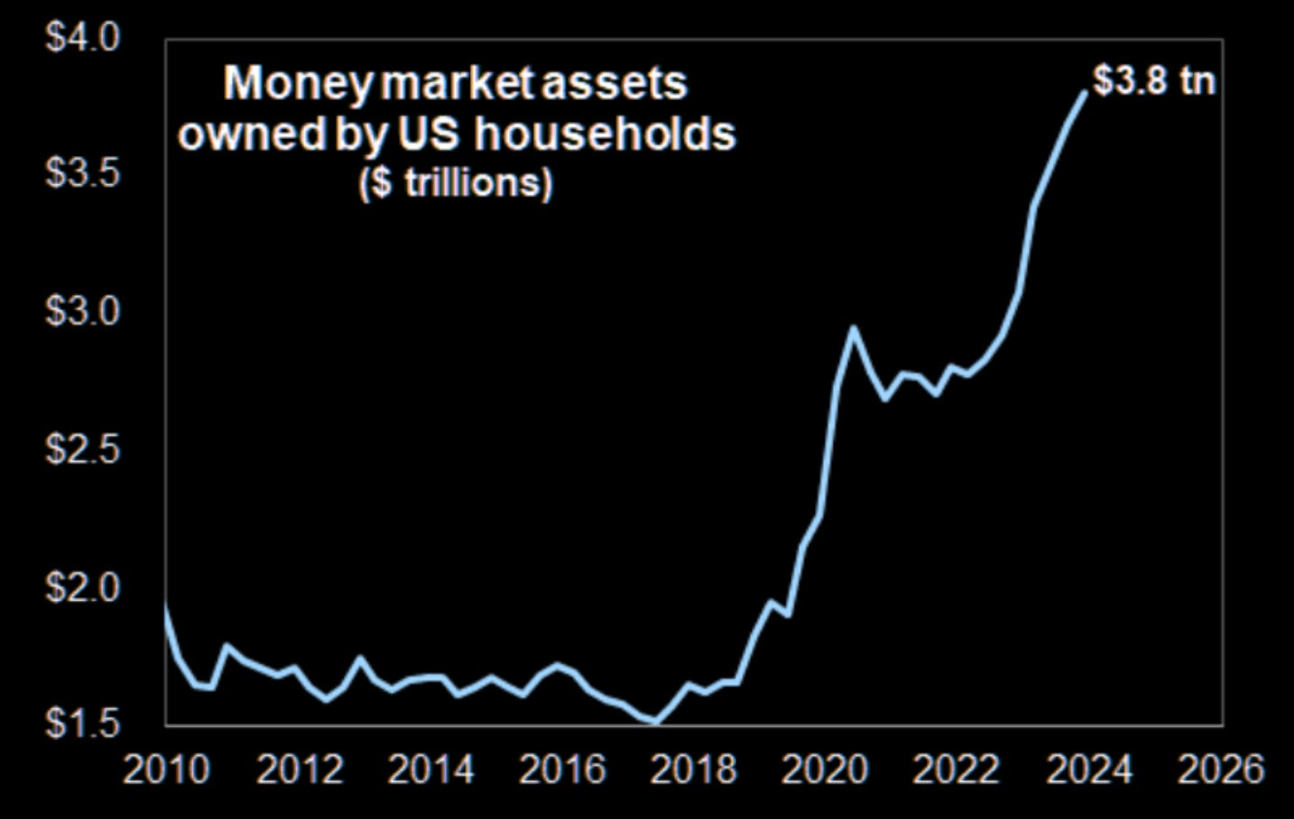 The substantial amount of money market funds held by US households indicates that they have significant purchasing power for equities. Currently, US households own $3.8 trillion in money market assets, marking a record high that is $1.5 trillion higher than pre-pandemic levels.