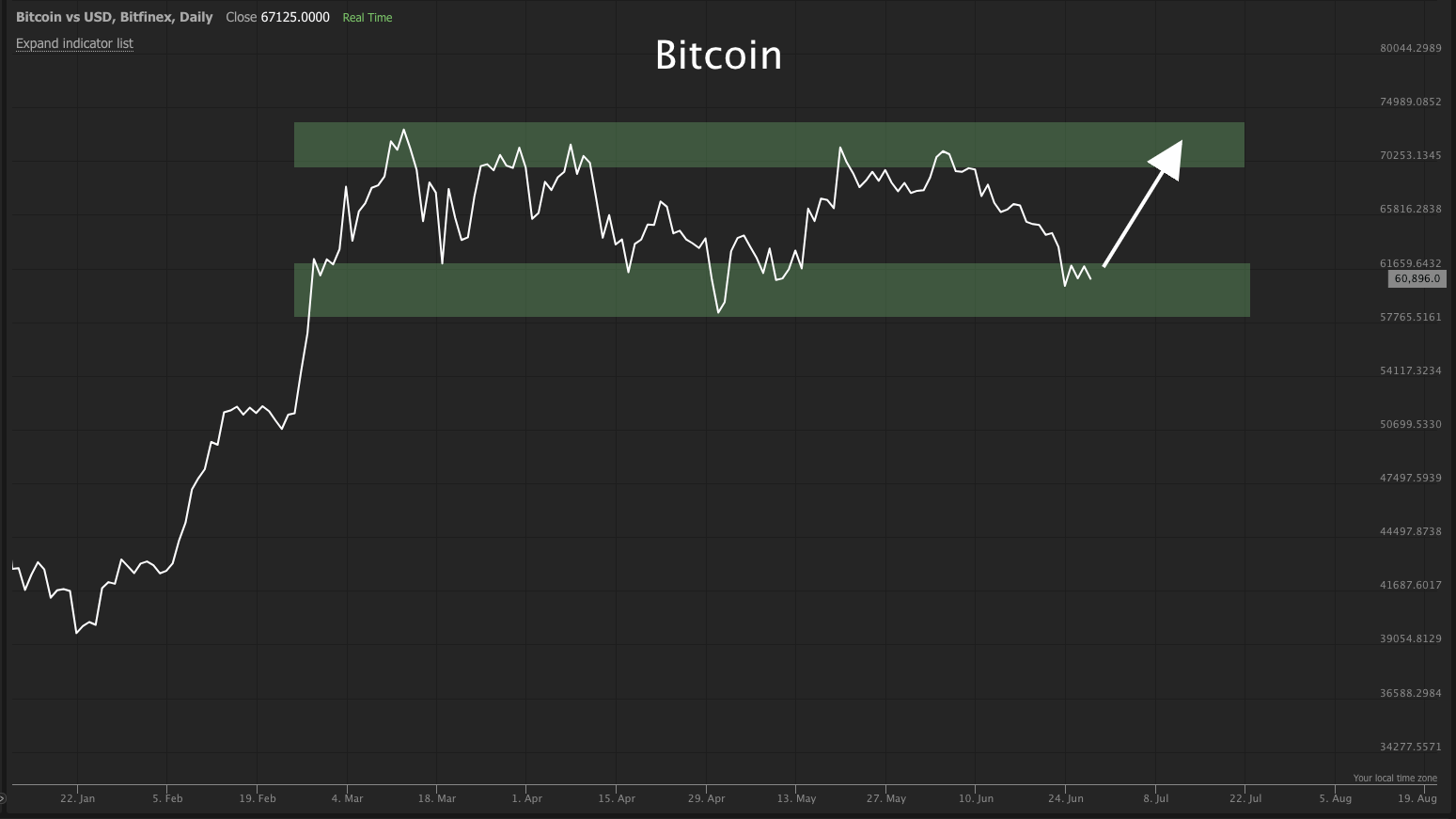 Bitcoin range trade. Bitcoin is currently trading within the large 60k to 72k range, with a notable support level around 62k, exactly where the current trading price stands. The price is below the 100-day moving average yet remains above the 200-day average. A close below 60k could be fatal.
