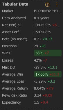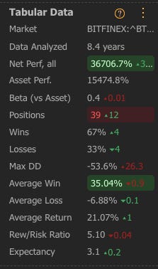 I look for a 5:1 risk to reward profile. Also how I size my positions on this system is based on the backtest. This system that I am showing you has a very high win rate for a trend system at 67% but Bitcoin data only goes back to the last decade. This same system uses a 35% trailing stop.