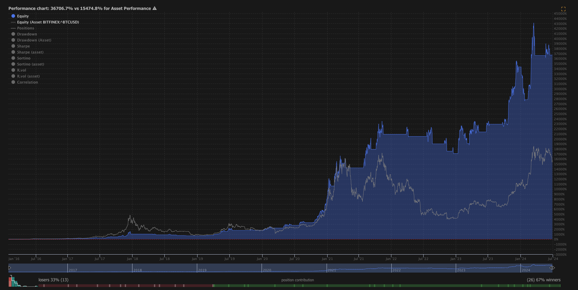 If I cut my stop loss in half, the return goes from 36706% to 13415%. It does not work for my strategy anymore. Still usable but our goal as traders should be to outperform the asset. If we are not outperforming, we should put our money in to the asset itself.