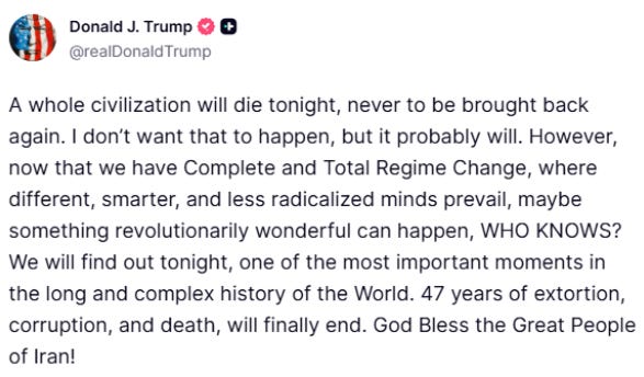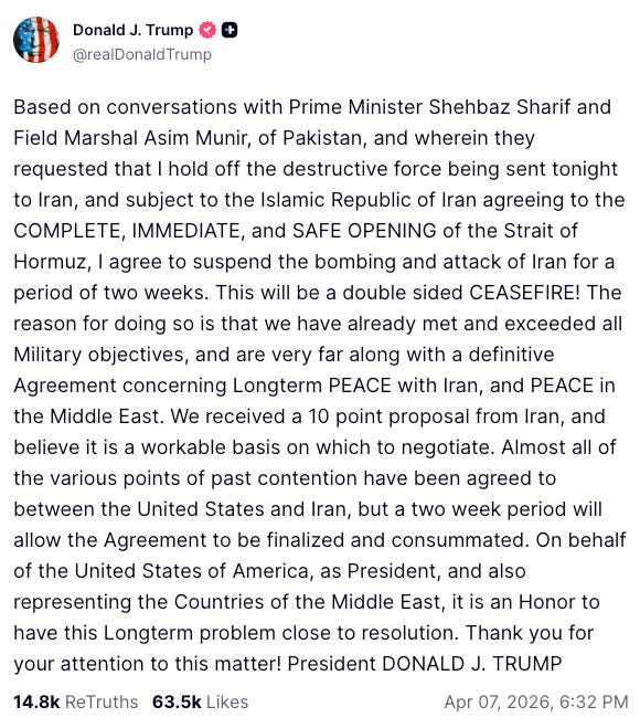Just yesterday, the tone was completely different. We went from talk of total destruction… “a whole civilization will die tonight” to a sudden pause, a ceasefire, and talk of long term peace… in less than 24 hours.