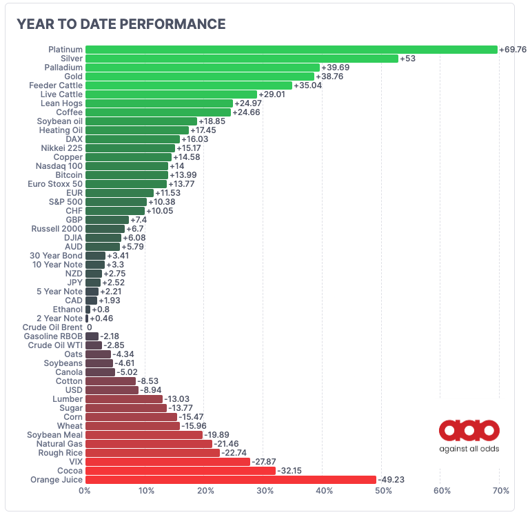 Think of this like a race. Each bar is a runner—gold, silver, platinum, hogs, coffee, bonds, the dollar, and so on.