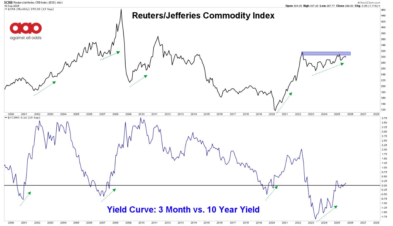 Look at the energy-heavy Reuters/Jefferies CRB Index pressing against resistance while the 3-month/10-year yield curve bull steepens. Historically, when commodities push higher while the Fed cuts, the long end takes over—and the curve steepens through reflation. That’s not an illusion. That’s the market’s truth.