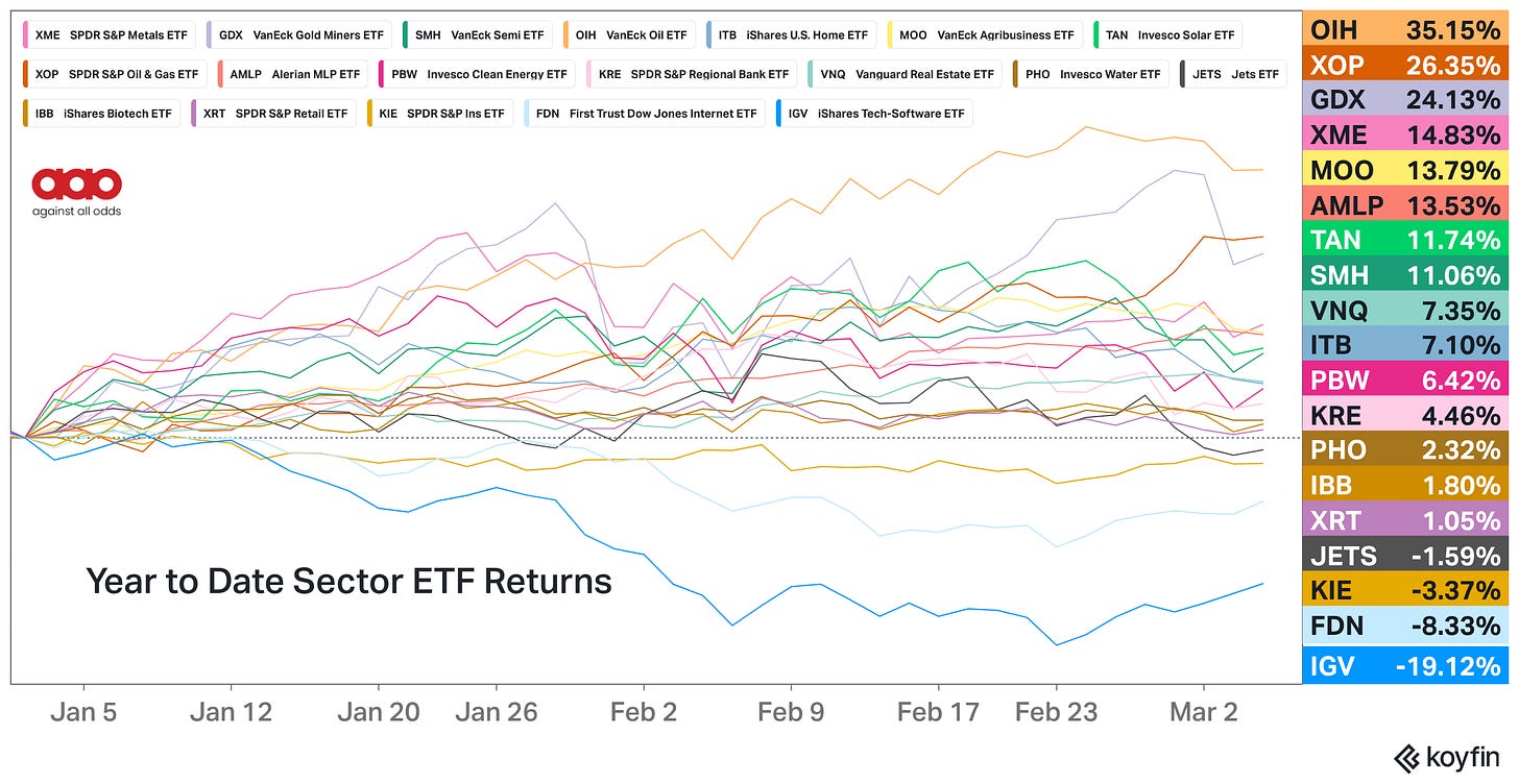 The leaders this year are not the sectors that dominated the last ten years. They are not software, mega-cap tech, or the classic growth stocks that investors have been trained to buy every dip in.