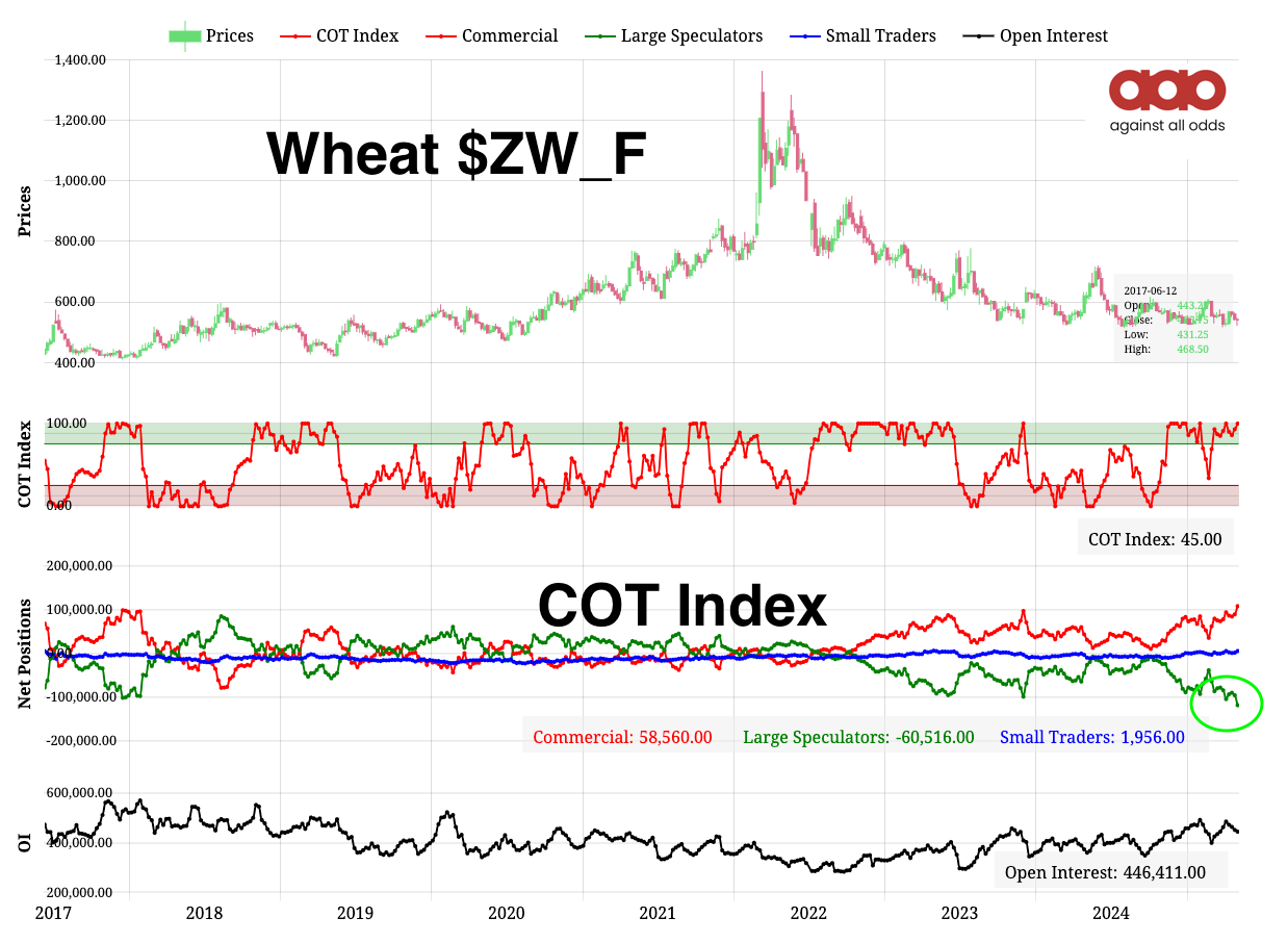 Speculators—often referred to as the "dumb money" in commodity markets—are now holding their largest net short position in wheat in over eight years. You can see it clearly on the chart: the green line representing large speculators has plunged to levels not seen since before 2017.